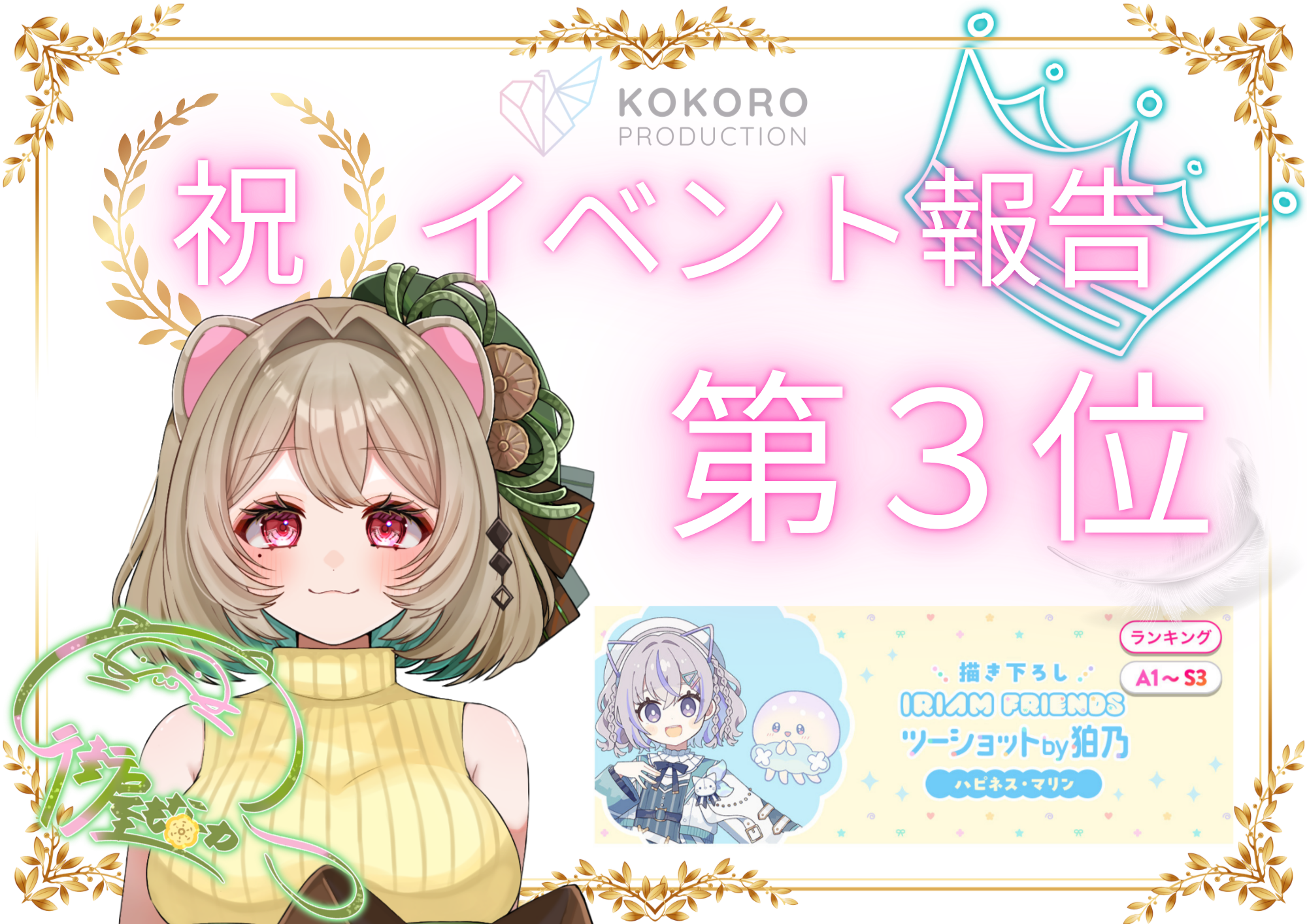 当事務所所属🍵街屋もなか🍵が、「IRIAM FRIENDZ ツーショット by 狛乃」イベントにて第3位をいただきました。